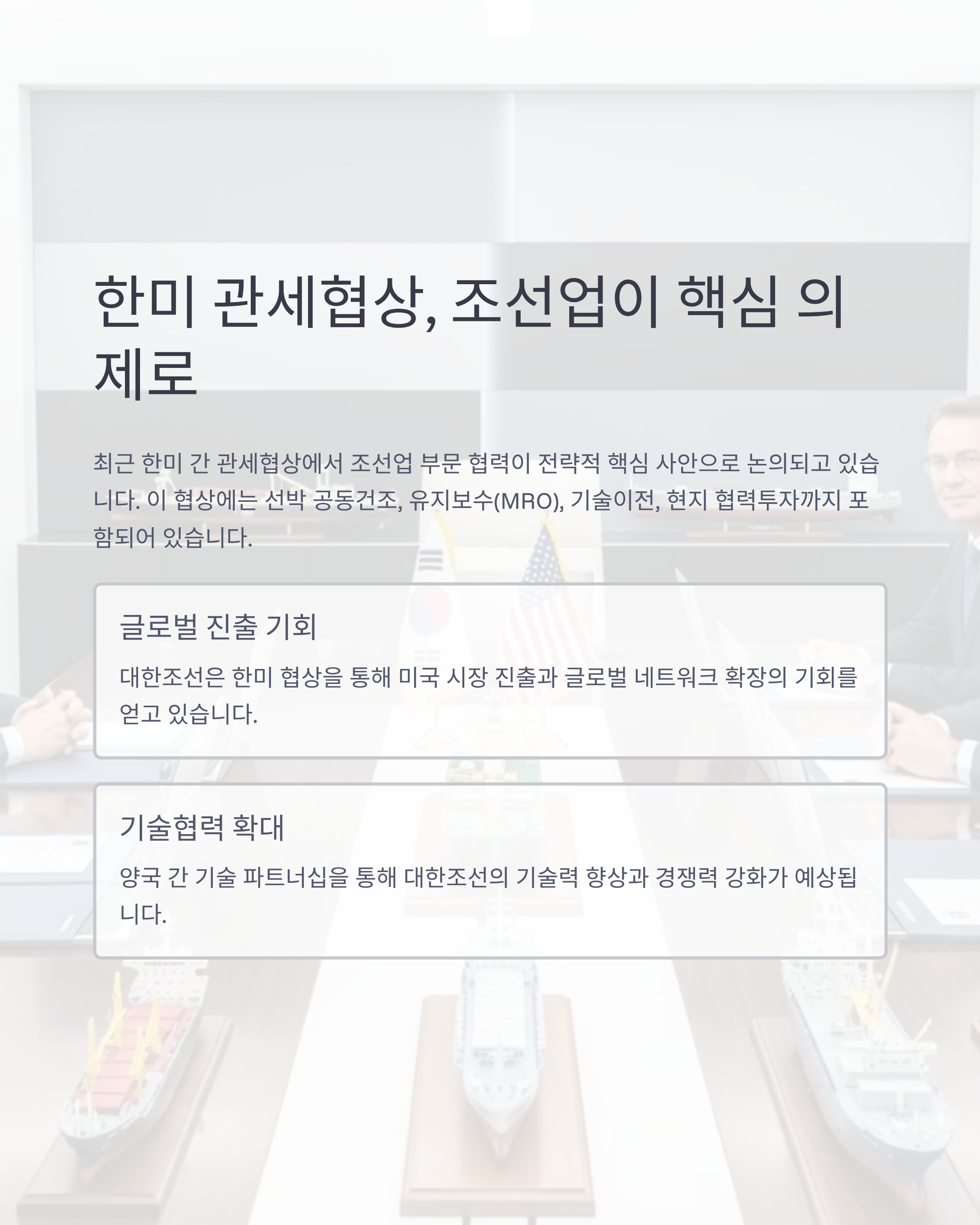 | 한미협상 결과 | 조선업 협력 공식화 및 제도적 뒷받침 가능성 |