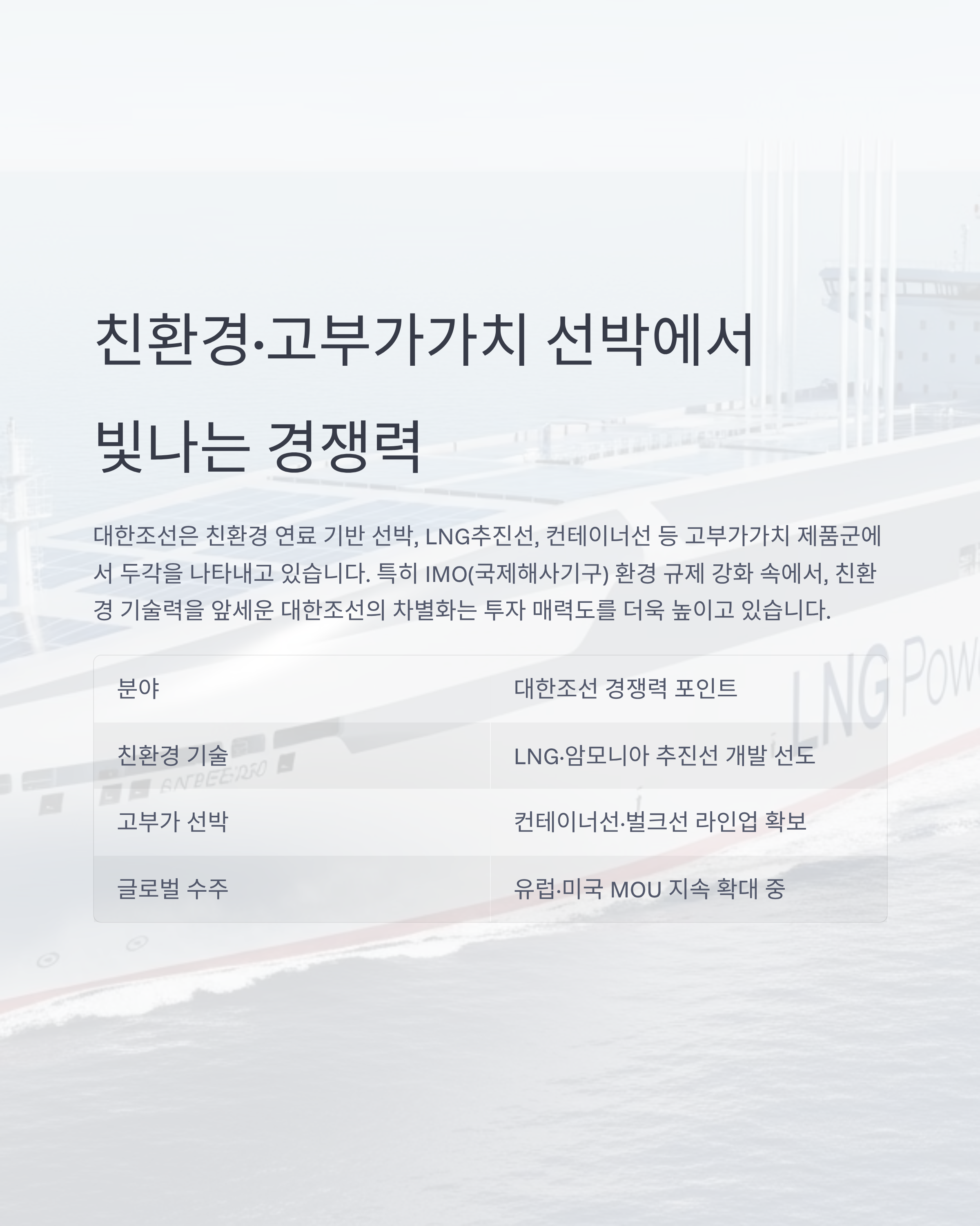 | 친환경 기술 | LNG·암모니아 추진선 개발 선도 |