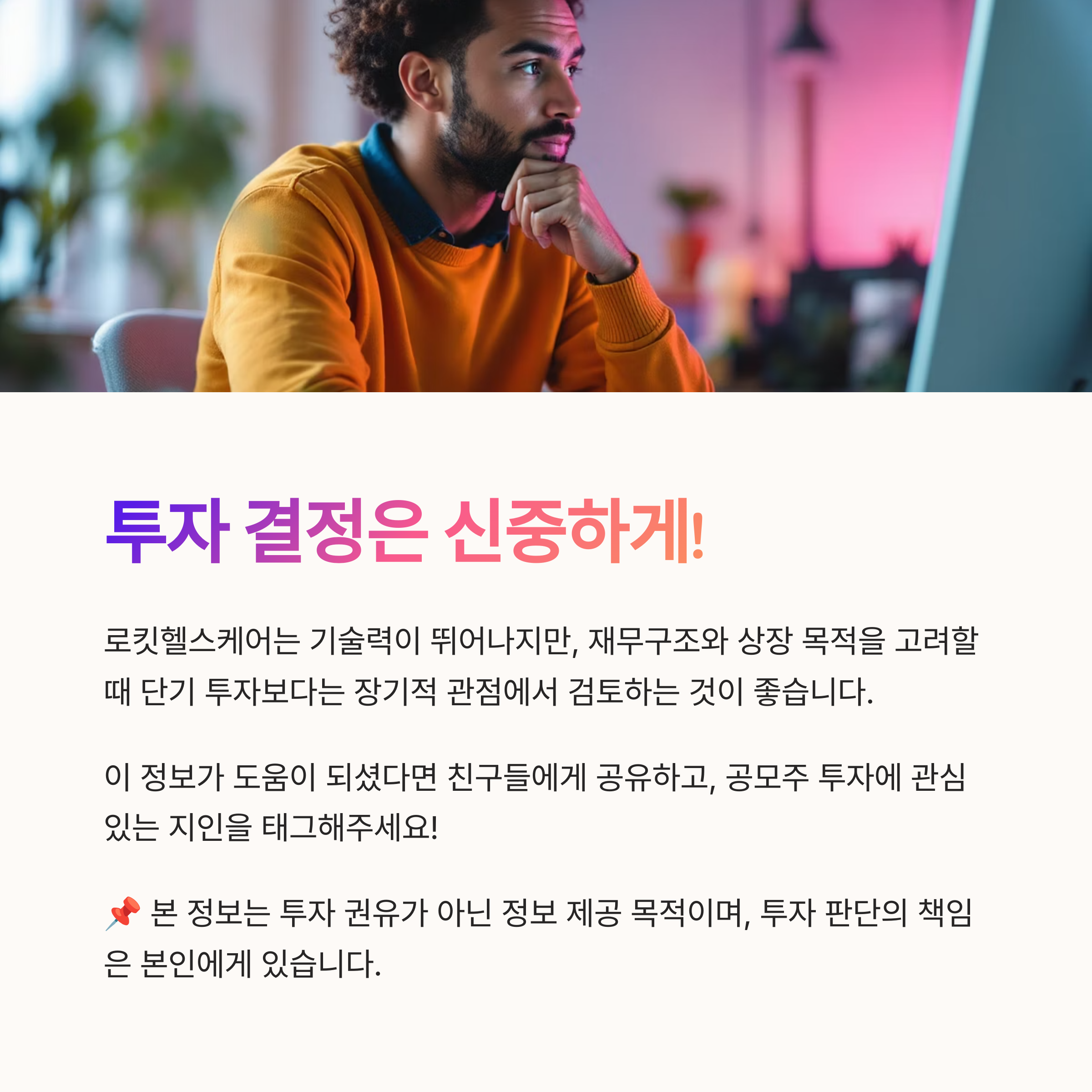 2025년 4월, 많은 투자자들의 시선을 끌고 있는 로킷헬스케어 공모주 청약이 곧 진행됩니다. 본 포스팅은 로킷헬스케어의 기업 개요부터 시작하여, 청약 일정, 공모가, 수요예측 결과까지 모두 정리해드릴 예정입니다. 투자에 앞서 어떤 점들을 주의해야 하는지, 신중한 투자 판단을 돕기 위해 정리된 정보이니 끝까지 읽어보시길 권장드립니다. 특히 이번 청약은 기술특례상장 방식으로 진행되며, 향후 의료기술 시장에서의 성장 가능성도 높이 평가되고 있어 장기 투자에 관심 있는 분들께도 유익한 정보가 될 것입니다. 로킷헬스케어가 어떤 기업인지부터 공모 정보와 리스크까지, 지금부터 하나씩 친절하게 살펴보겠습니다.