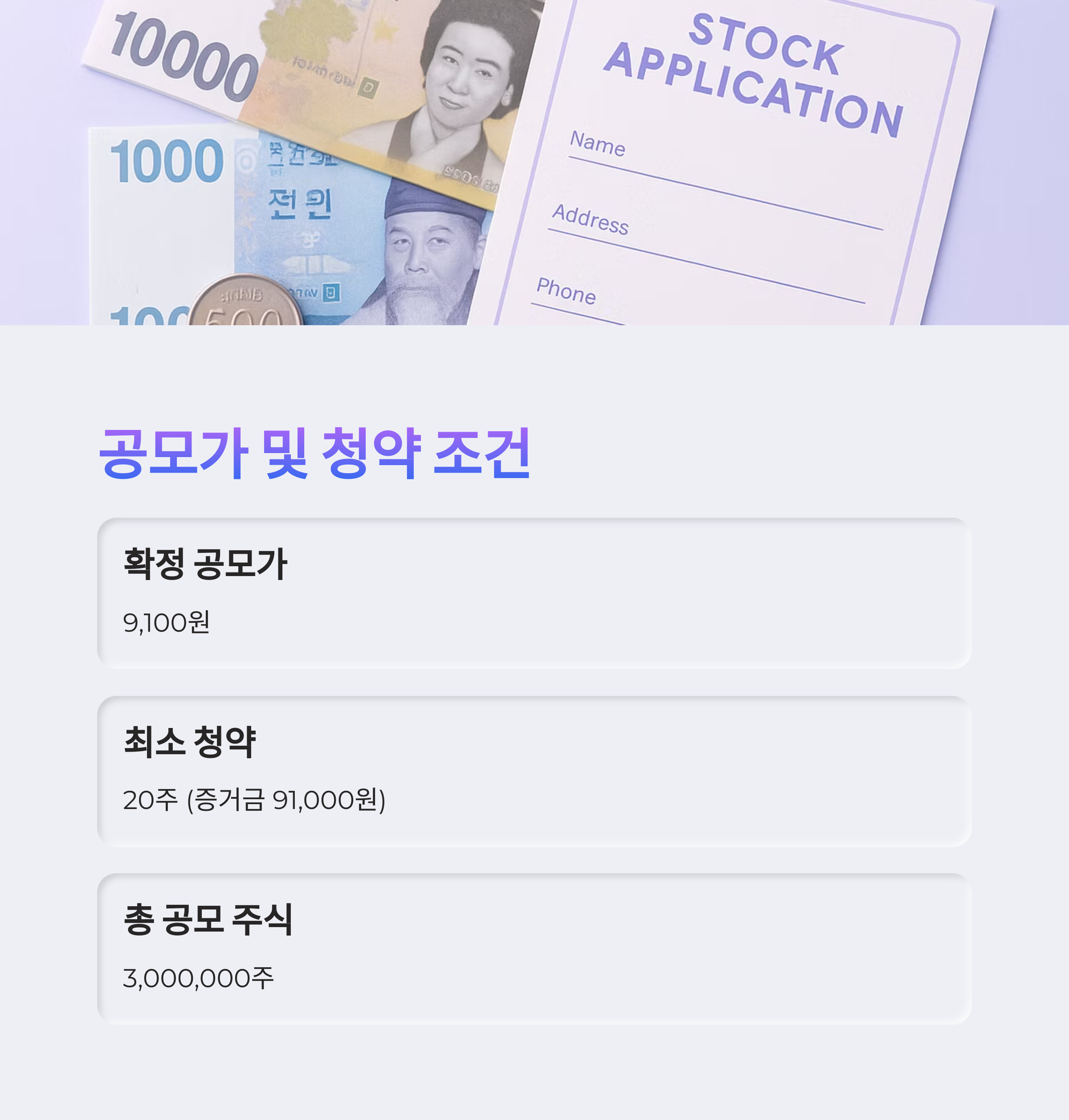 희망 공모가 밴드는 8,000원에서 9,100원이었으며, 최상단에서 확정되며 흥행에 성공한 것으로 평가됩니다.