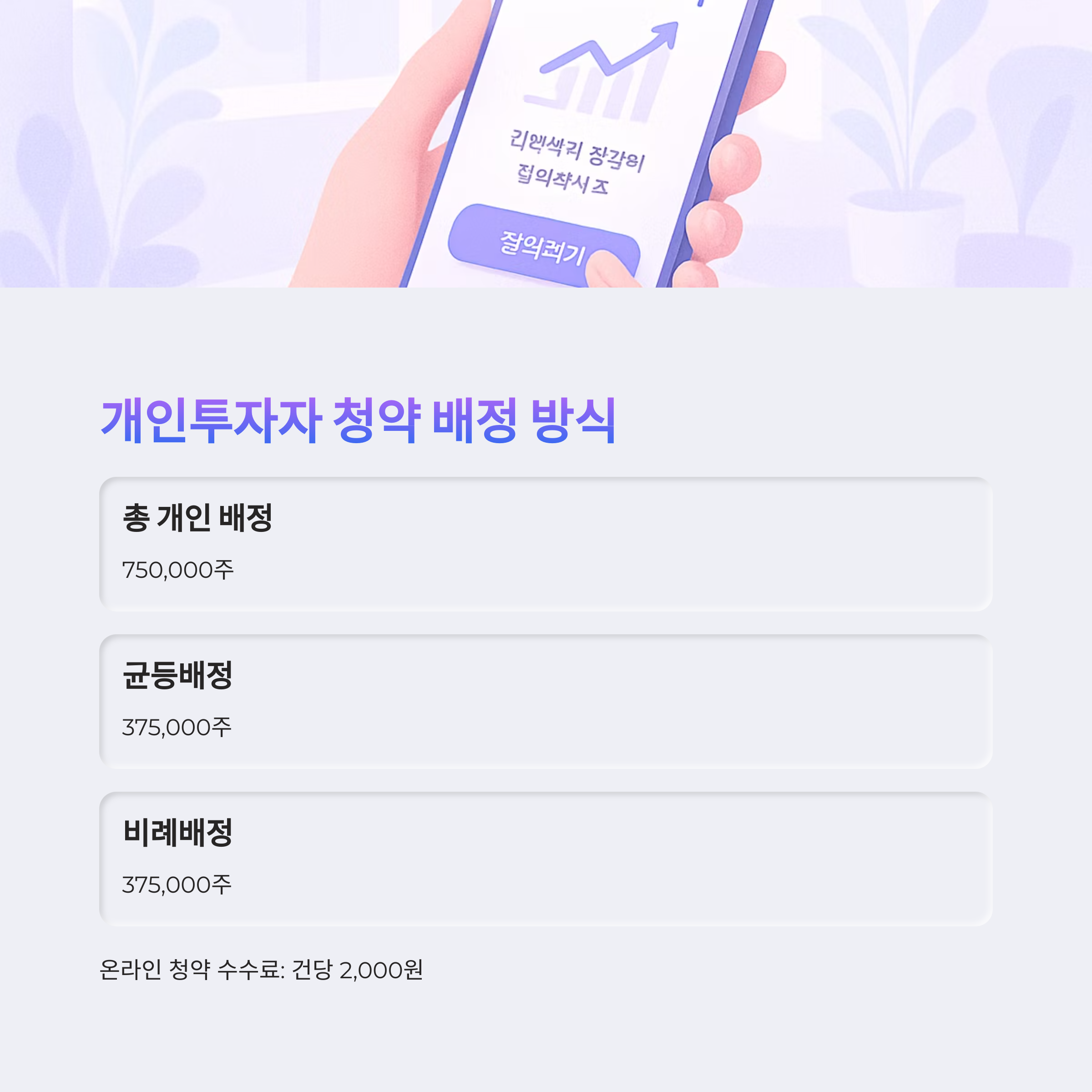개인투자자 배정 수량은 총 750,000주, 이 중 균등배정 375,000주, 비례배정 375,000주로 나뉘어 있습니다.