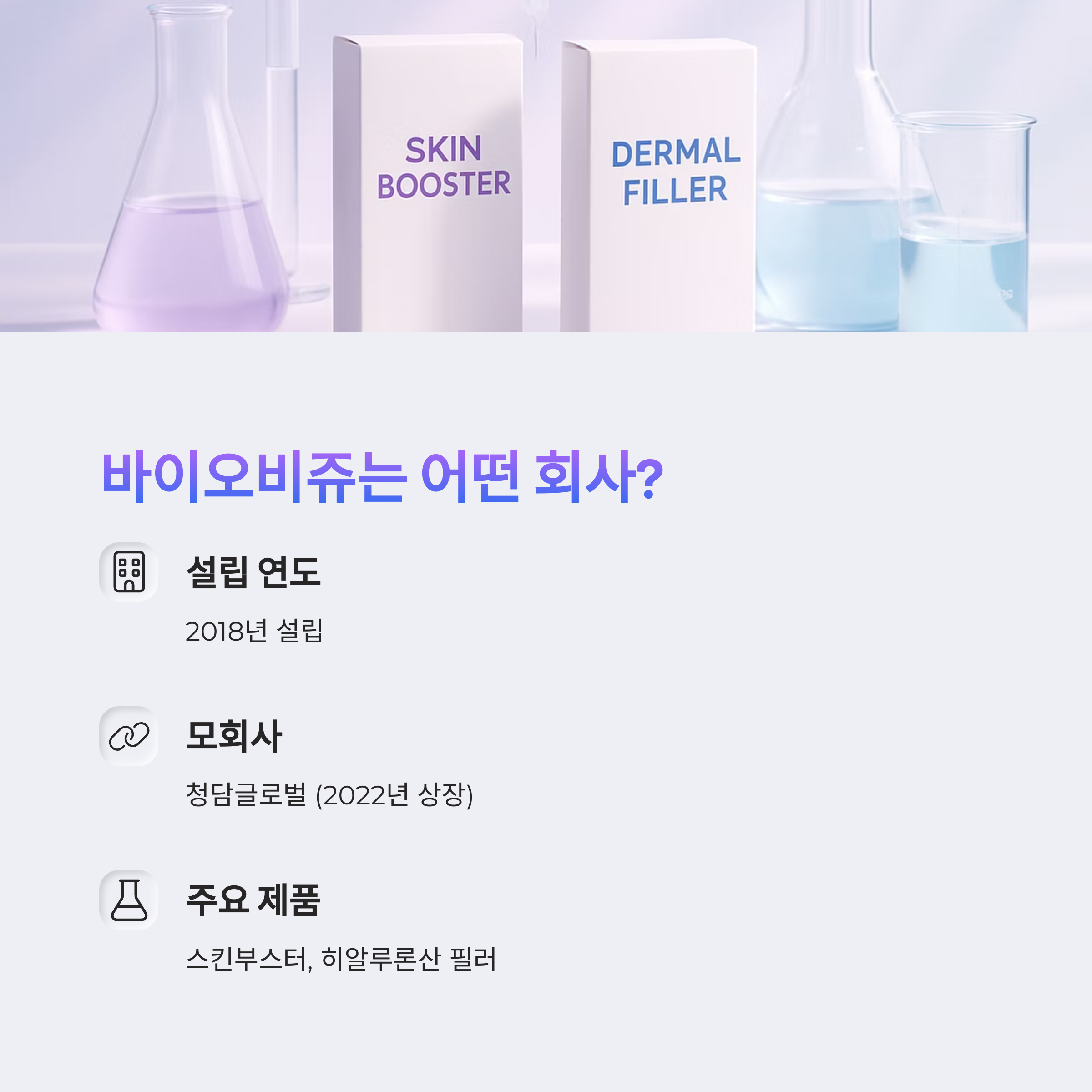 바이오비쥬는 2018년에 설립, 모회사는 2022년 상장한 청담글로벌입니다.