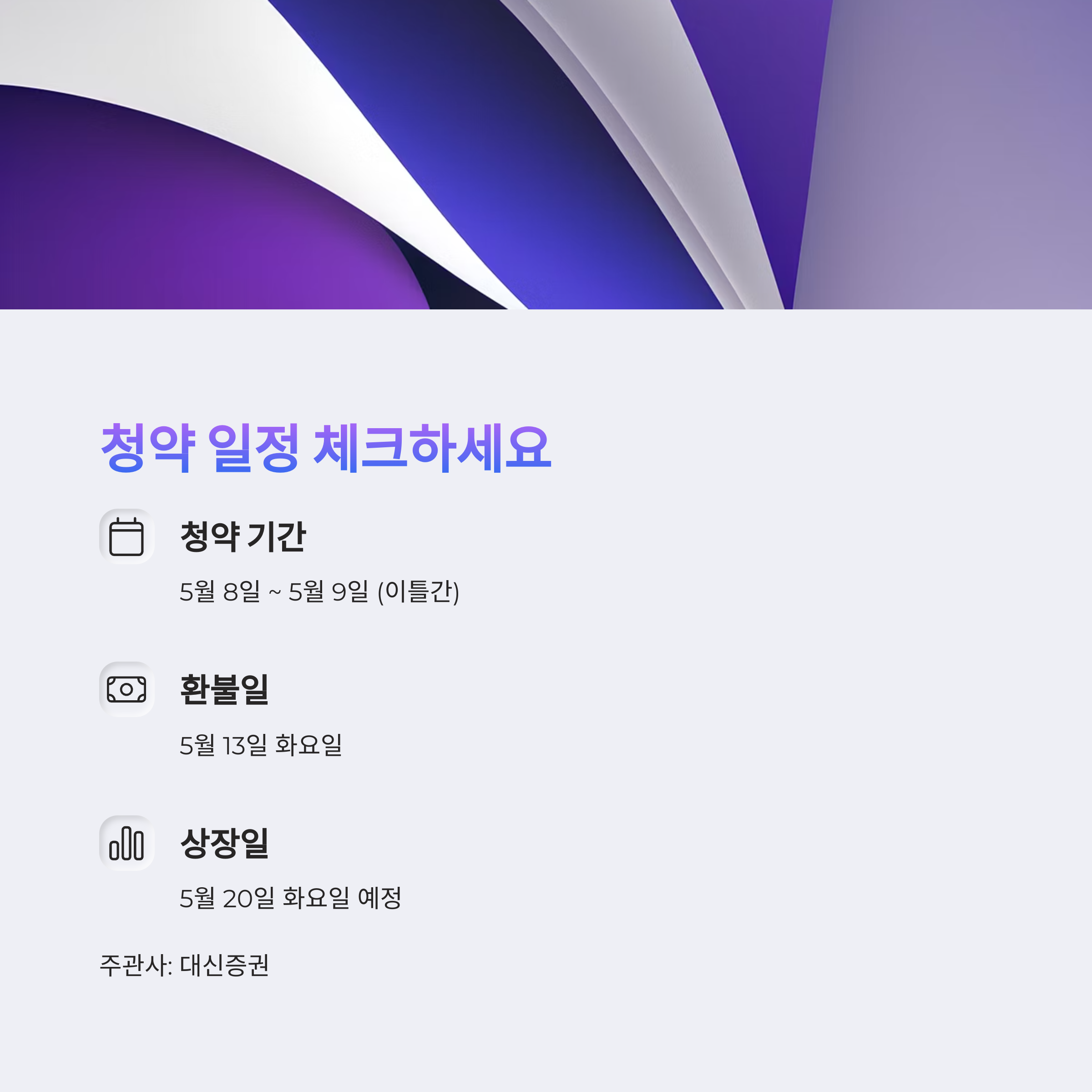 단독 주관사는 대신증권이며, 환불일은 5월 13일 화요일, 상장 예정일은 5월 20일 화요일로 잡혀 있습니다.