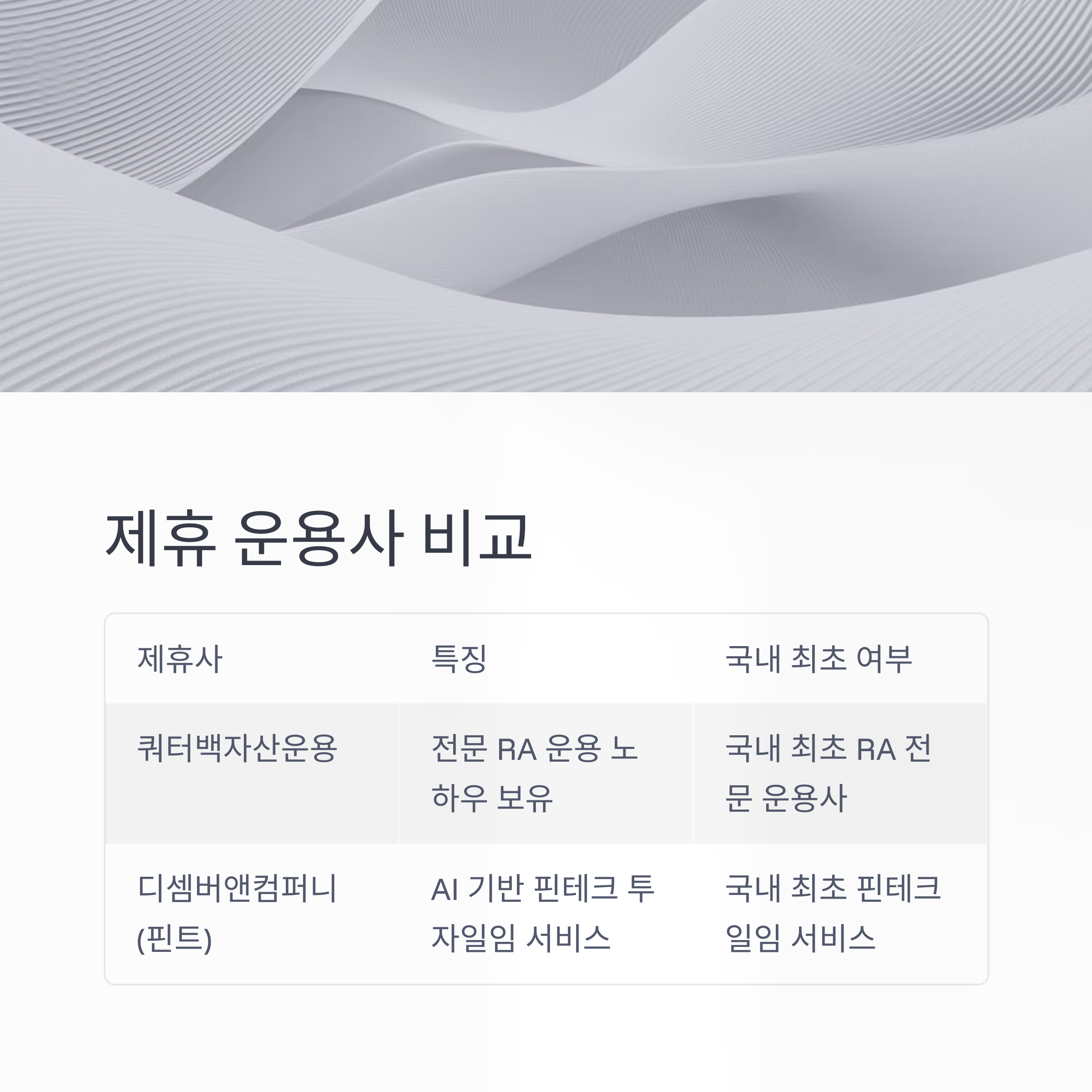 | 쿼터백자산운용 | 전문 RA 운용 노하우 보유 | 국내 최초 RA 전문 운용사 |