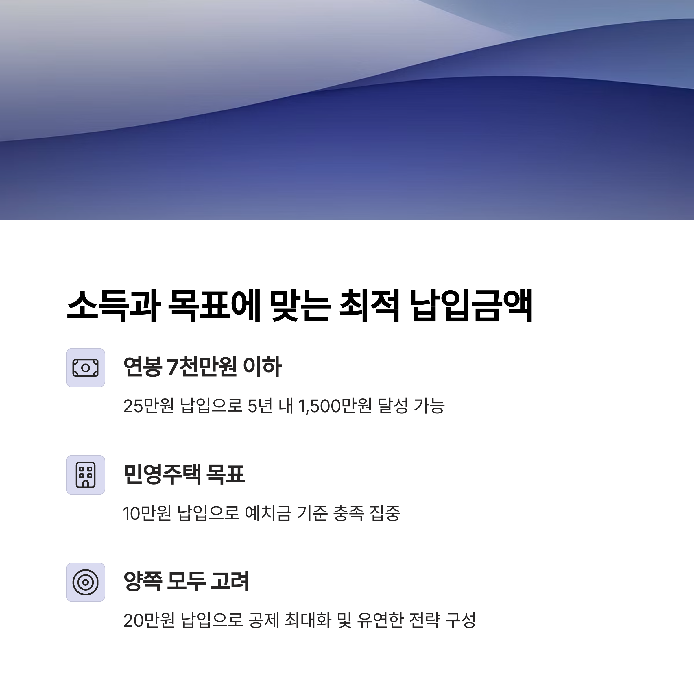 | 연봉 7천만원 이하 무주택자 | 25만원 | 국민주택 노릴 경우 유리, 5년 내 1,500만원 가능 |