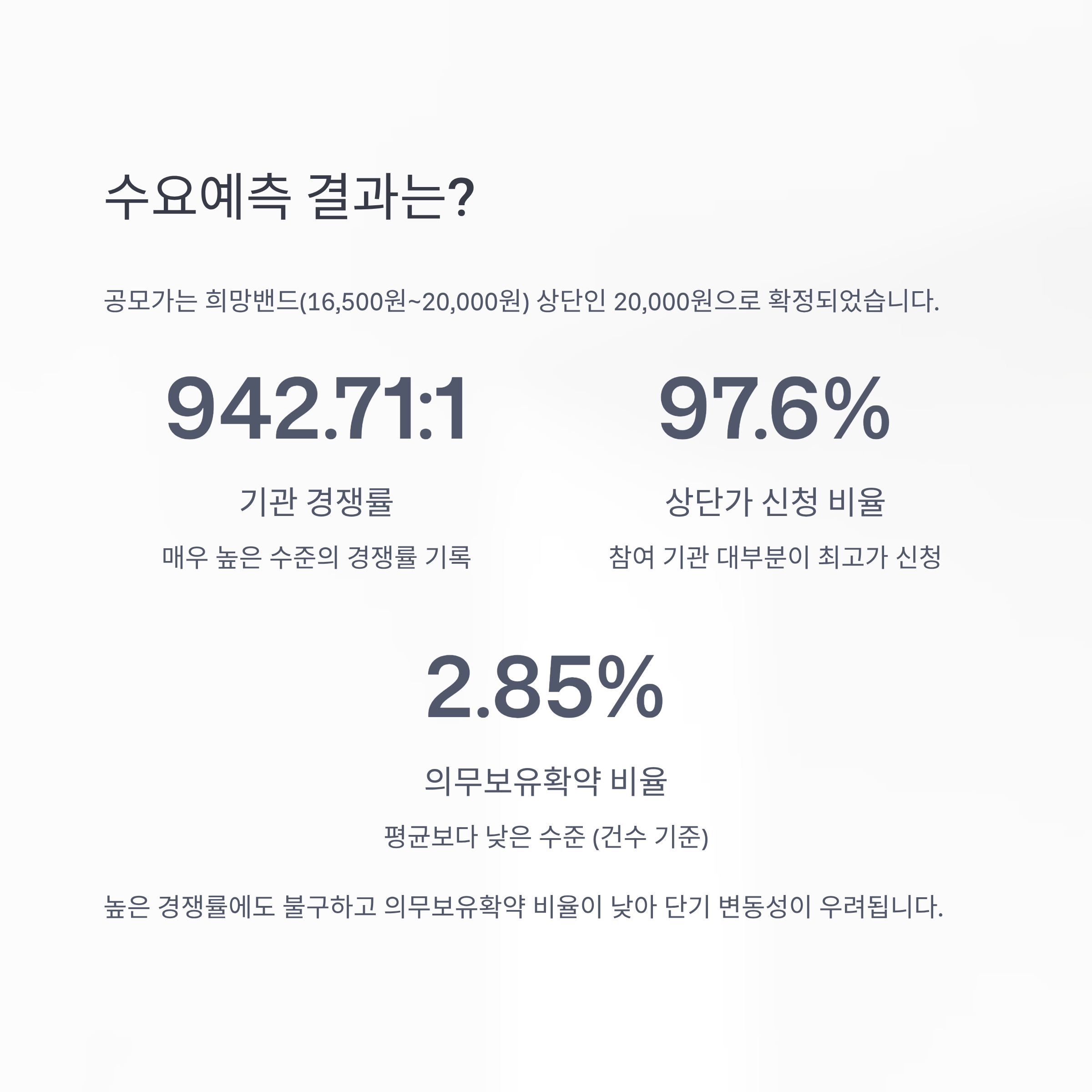 20,000원으로 결정되었습니다. 기관 경쟁률은 942.71대 1로 매우 높았으며,