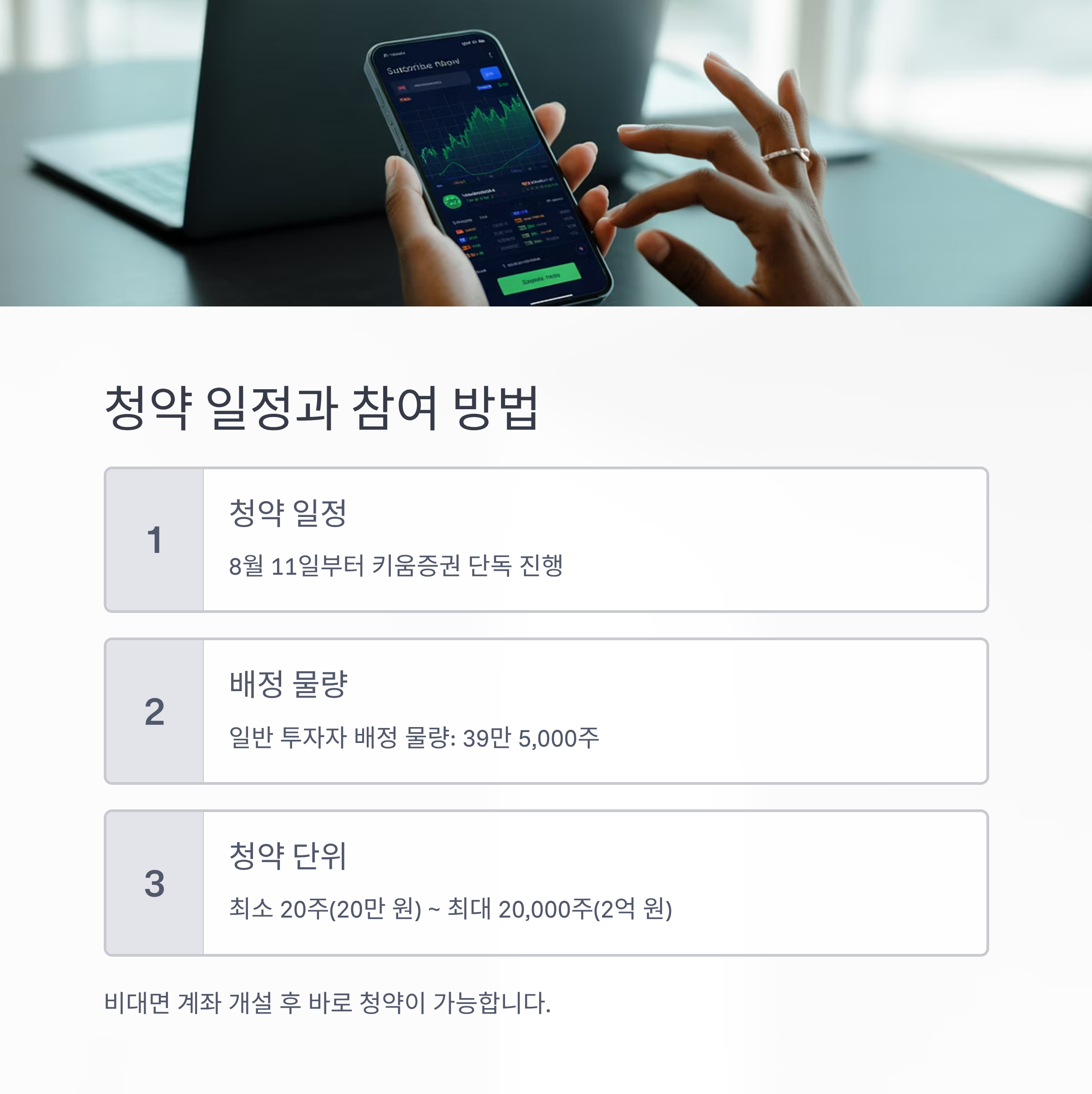 8월 11일부터 키움증권 단독 청약이 시작되며, 상장은 8월 21일 예정입니다.