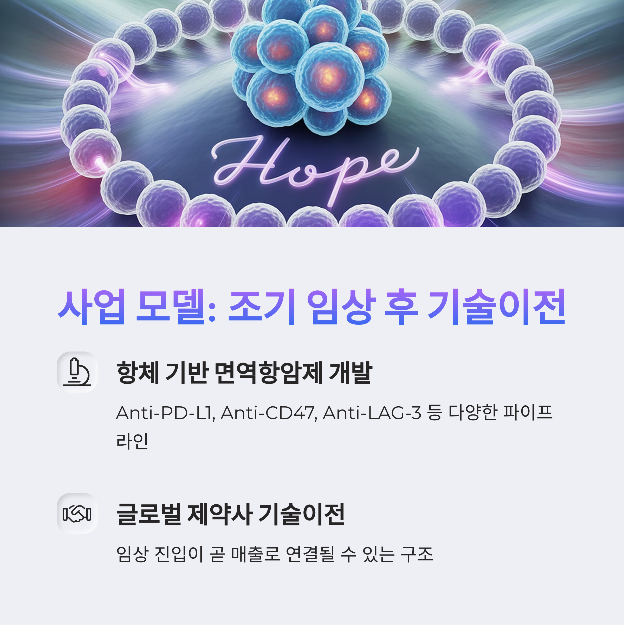 현재 Anti-PD-L1, Anti-CD47, Anti-LAG-3 등 다양한 파이프라인을 확보하고 있으며,