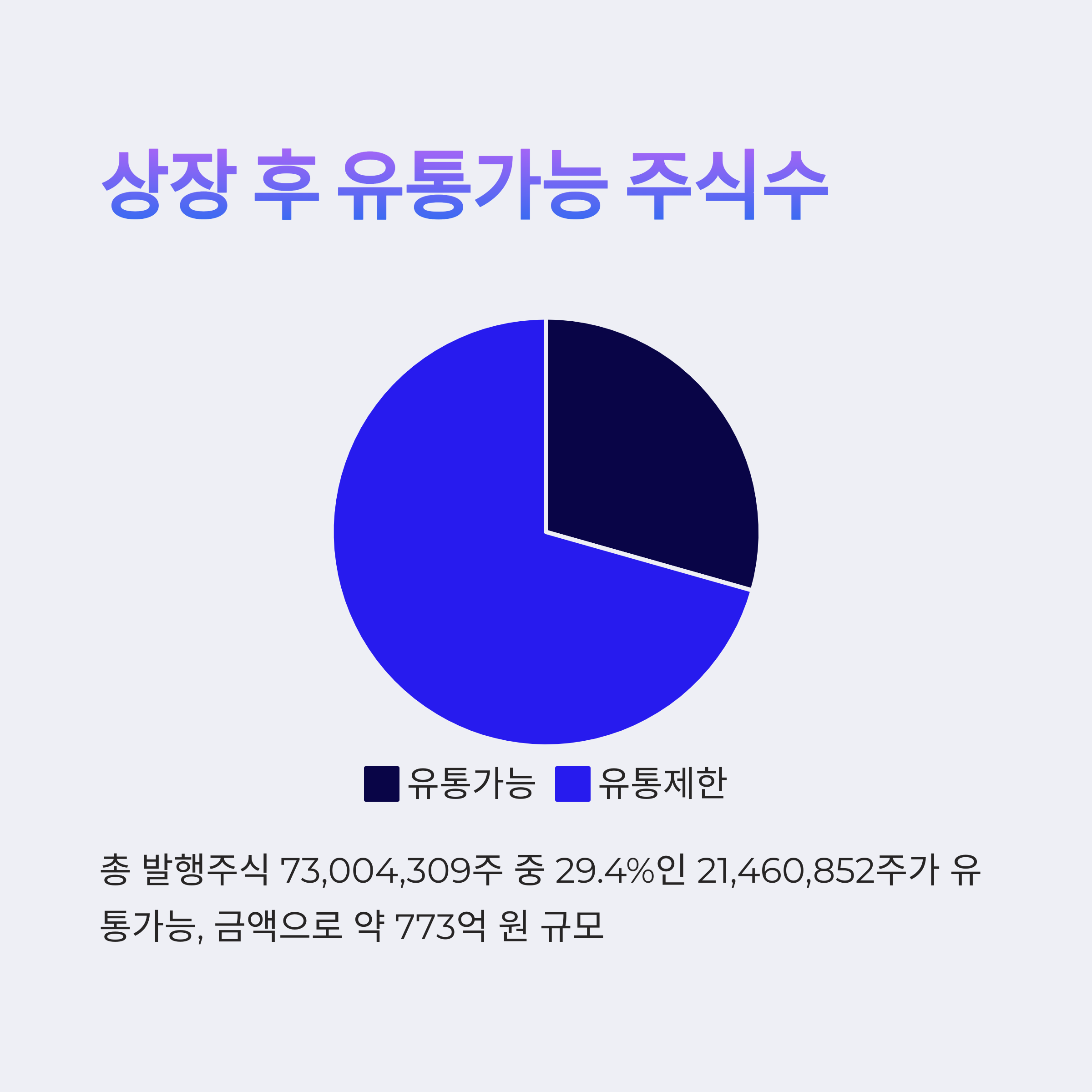 | 상장 후 유통가능 주식수 | 21,460,852주 (29.4%) |
