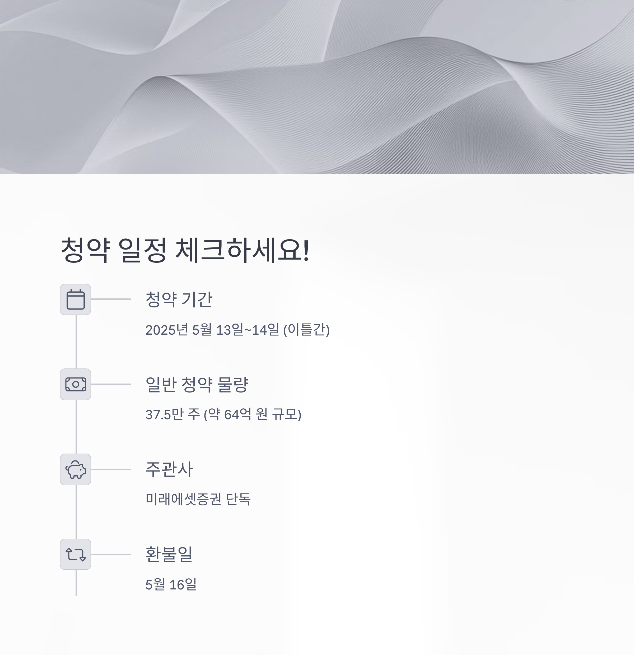 청약 환불일은 5월 16일로 예정되어 있어, 일정 상 단기 자금 운영이 중요합니다.
