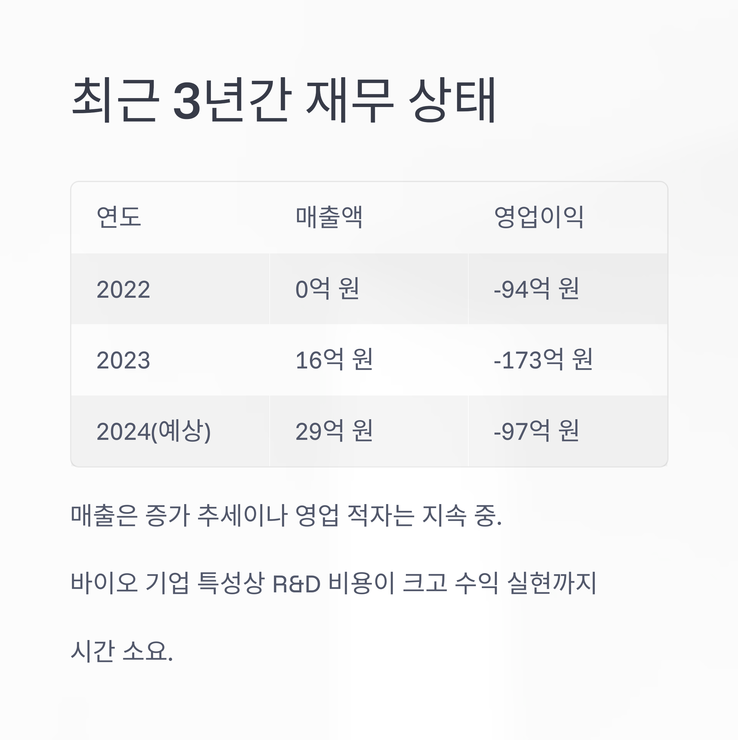 다만 기술 기반의 바이오 기업 특성상, 연구개발 비용이 크고 수익 실현까지 시간이 걸리는 점은 고려되어야 합니다.