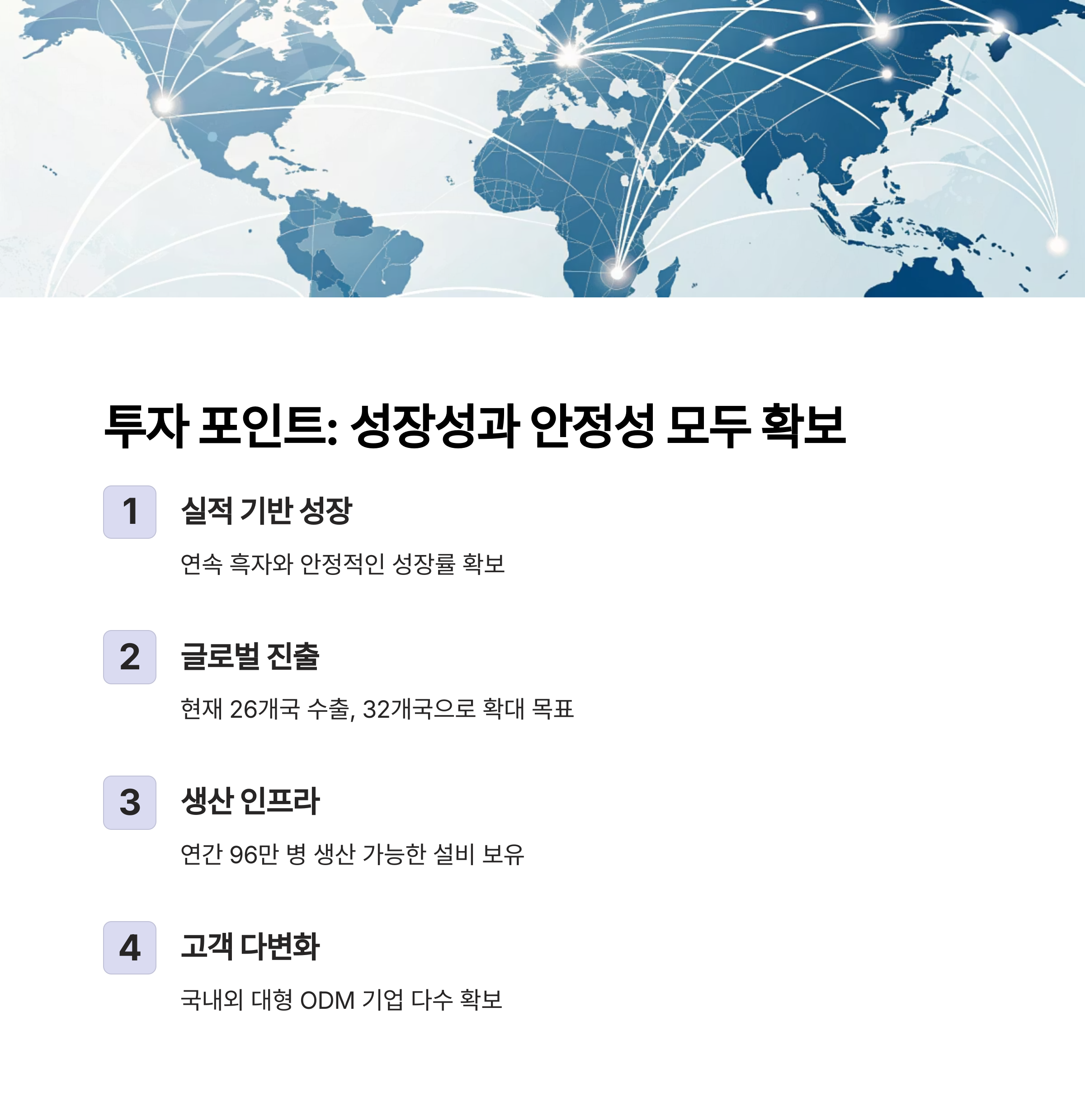 - 생산 인프라 확보: 연간 96만 병 생산 가능한 설비