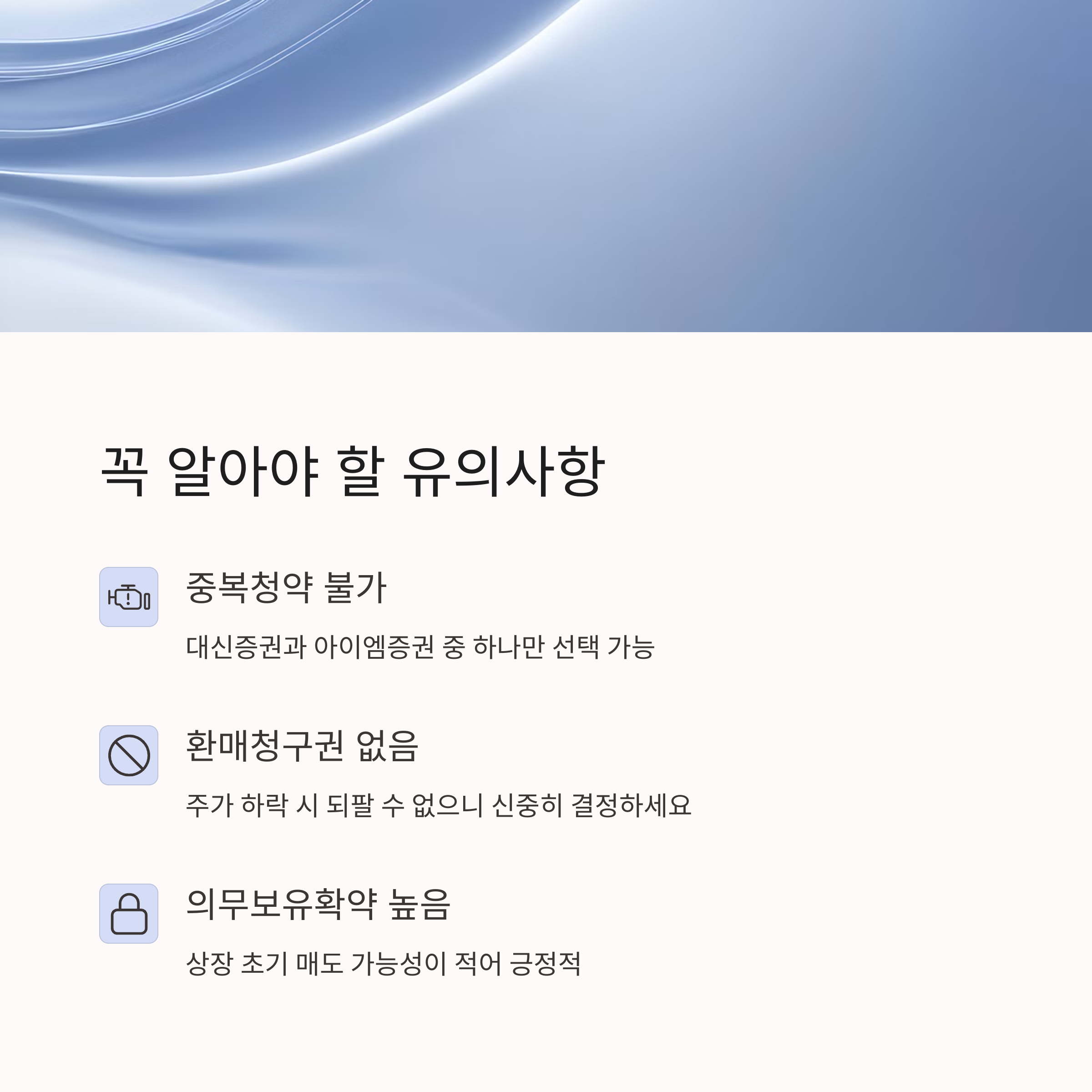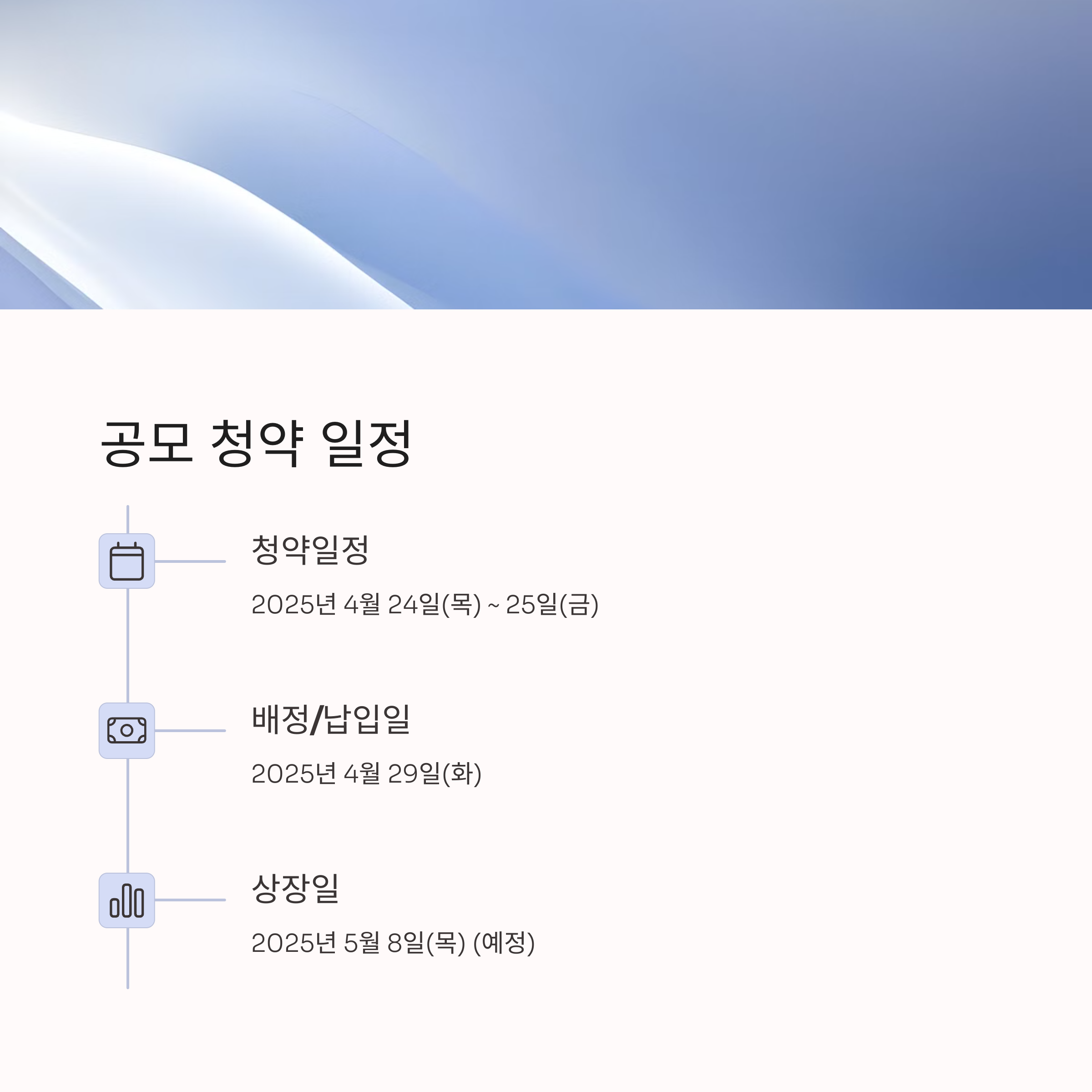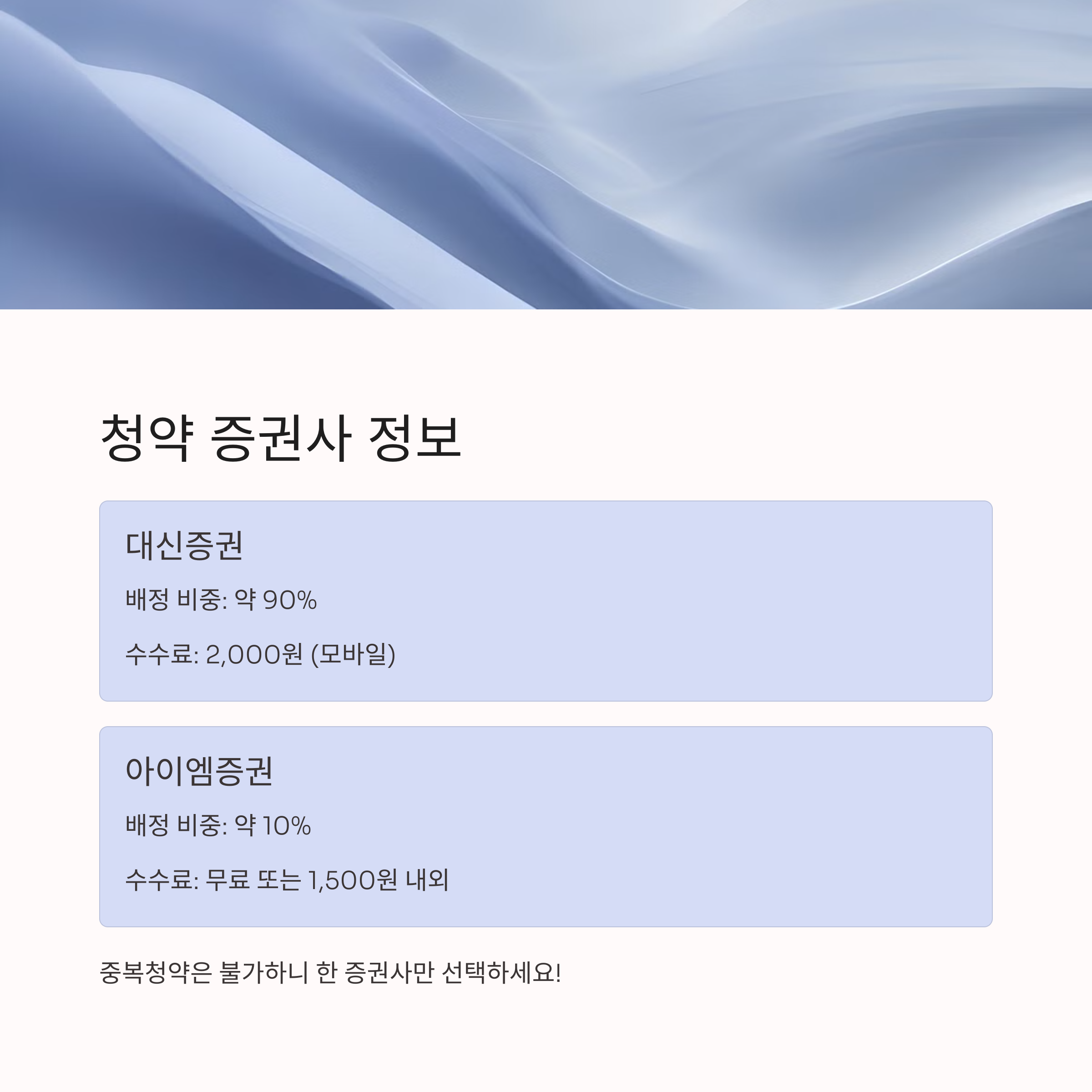 청약 일정은 2025년 4월 24일부터 25일까지 진행되며, 상장은 5월 8일로 예정되어 있습니다. 대신증권과 아이엠증권에서 청약이 가능하며, 최소 청약 수량은 20주로, 청약 금액은 136,000원, 증거금은 68,000원입니다. 대신증권은 약 90%, 아이엠증권은 10% 정도 배정을 맡고 있으며, 각 증권사의 수수료 정책은 다르므로 청약 전 반드시 확인이 필요합니다. 청약 전략 수립에 있어 중복청약 금지 및 환매청구권 미적용 항목도 꼼꼼히 확인하시기 바랍니다.