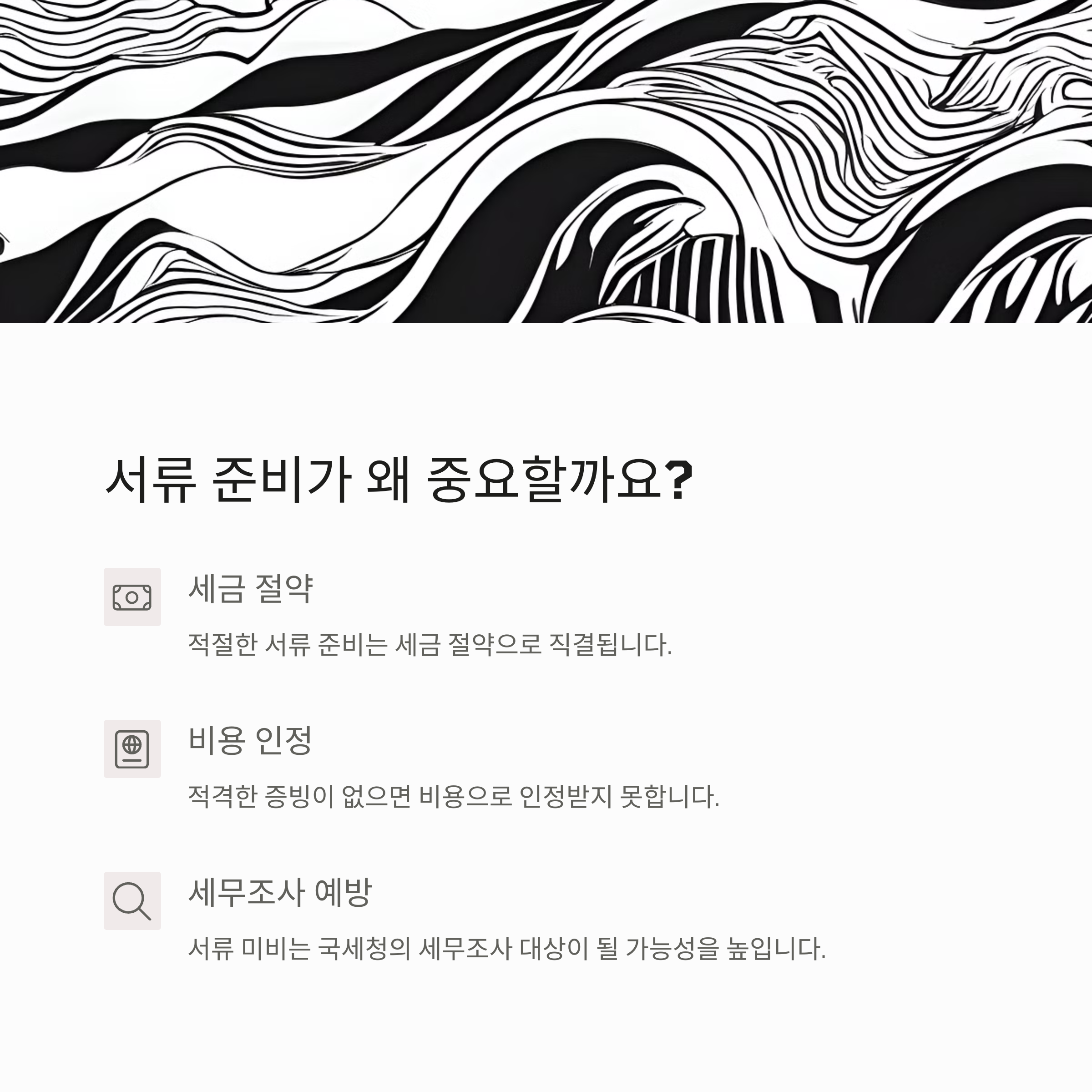 또한 서류 미비는 국세청의 세무조사 대상이 될 가능성을 높입니다. 세무조사를 받게 되면 시간과 비용이 추가로 소요될 뿐만 아니라, 잘못된 신고로 판단될 경우 가산세까지 부담해야 합니다.
